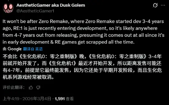 此外,据Dusk Golem称,长期传闻中的《生化危机:代号 维罗妮卡》重制版将是下一款推出的《生化危机》作品,预计于2027年发售。随后是《生化危机0》重制版,目标发售时间为2028年。再往后,系列正统续作《生化危机10》可能会在《生化危机0》重制版之后推出。而《生化危机1》重制版则“最近才刚刚进入制作阶段”。