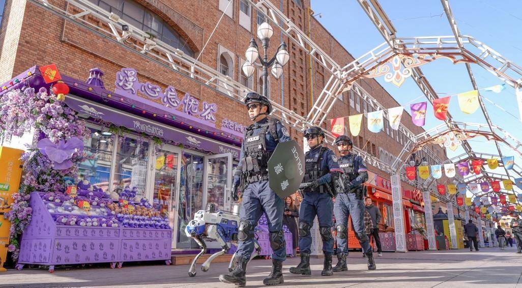 2025年11月17日,乌鲁木齐市公安局特警特战支队二道桥巡控大队在新疆国际大巴扎巡逻,利用机器狗进行反诈宣传(资料图)。刘华祥摄