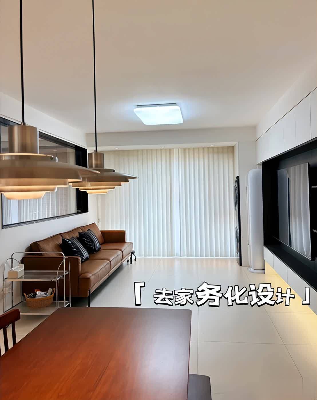 客厅茶几会加重家务负担,去掉茶几后,客厅更宽敞,打扫卫生也便捷许多。