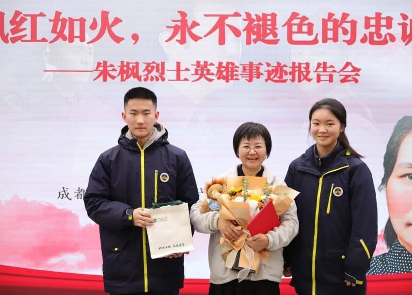 在成都二中,“枫红如火,永不褪色的忠诚——朱枫烈士事迹报告会”在励耘厅举行。为帮助学生更好理解人物和时代背景,学校提前组织政史学科融合备课,开展前置学习。报告会上,朱容瑢女士借助珍贵历史照片、亲笔书信和家族回忆,生动呈现了朱枫烈士从进步青年到隐蔽战线巾帼英雄的生命轨迹,展现了她既温暖细腻又刚毅如钢的双重品格。报告结束后,学校为朱容瑢女士颁发“大思政教育指导专家”聘书。